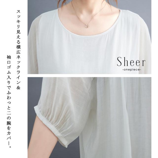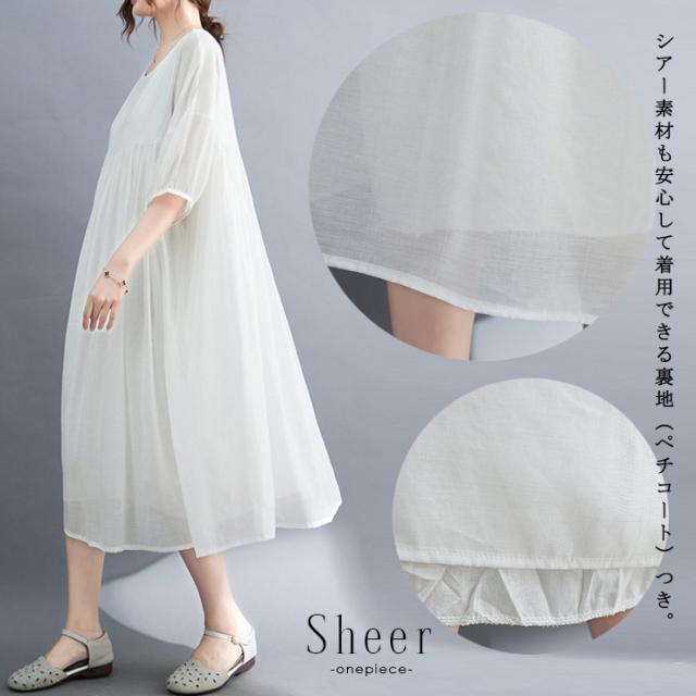 ワンピース 無地 レディース 膝下 ギャザー シアー 大きいサイズ (56291)