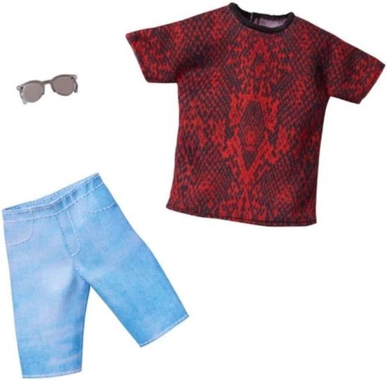 Barbie Fashions Pack: Ken Doll Clothes with Red & Black Patterned T-Shirt, Blue Shorts & 1 Pair of Sunglasses, Gift for Kids 3 to 8 Years Old
