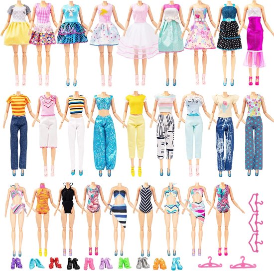 Barbie バービー用の人形服とアクセサリー-24アイテムギフトセット、9セットのファッションウェアには、3つのスカート、3つのトップ3パンツと3つの高品質の水着、5つのハンガーと10ペアの靴が含まれます