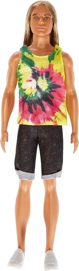 ・Ken doll wears a colorful tie-dye tank top and denim shorts.