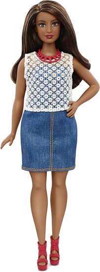 ・Barbie Fashionistas doll includes a denim dress paired with a pretty, white lace top.