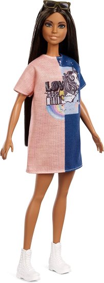 ・Barbie doll wears a pink and blue t-shirt dress with fun mixed graphic.