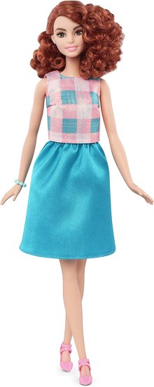 ・Barbie Fashionistas doll includes a pink, white and teal plaid top with a matching teal skirt.
