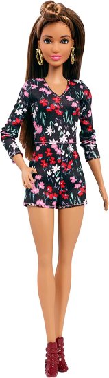 ・Barbie doll goes "black to blooms" in a black romper with floral print.
