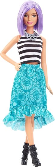 ・Barbie Fashionistas doll is trendy pairing a black and white striped top with shimmery blue print skirt.