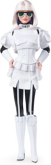 ・Star Wars Stormtrooper x Barbie doll evokes the Stormtroopers" plastoid armor in head-to-toe white over a black patent leather-inspired bodysuit.