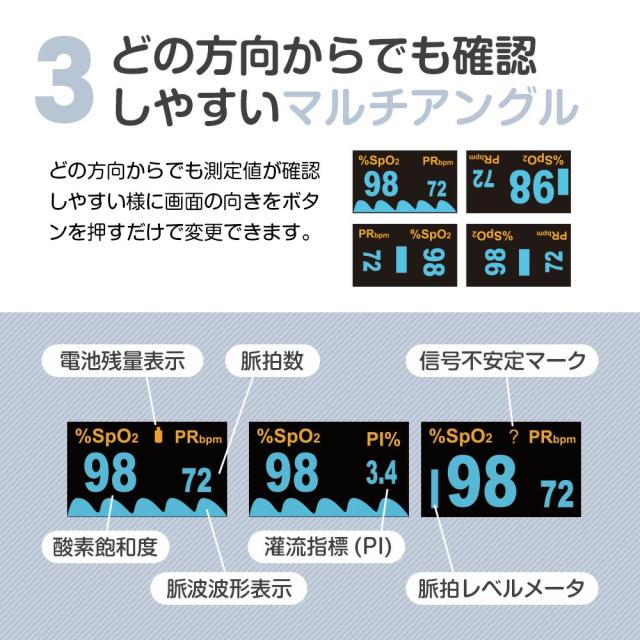 - 酸素飽和度が95%以下になりやすいため、外出時の確認をするのに購入しました。 外でも見やすいので重宝しています。