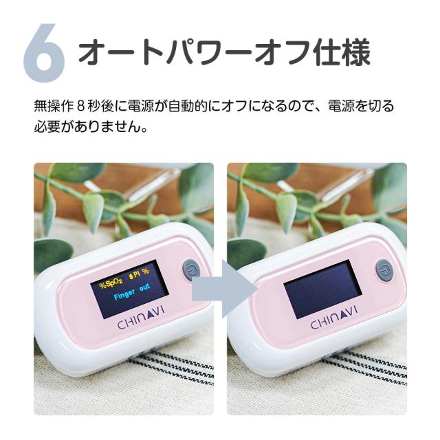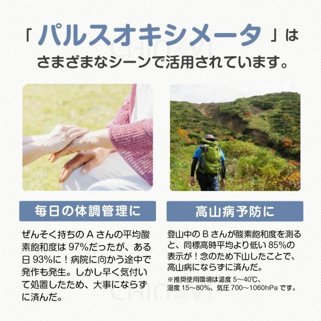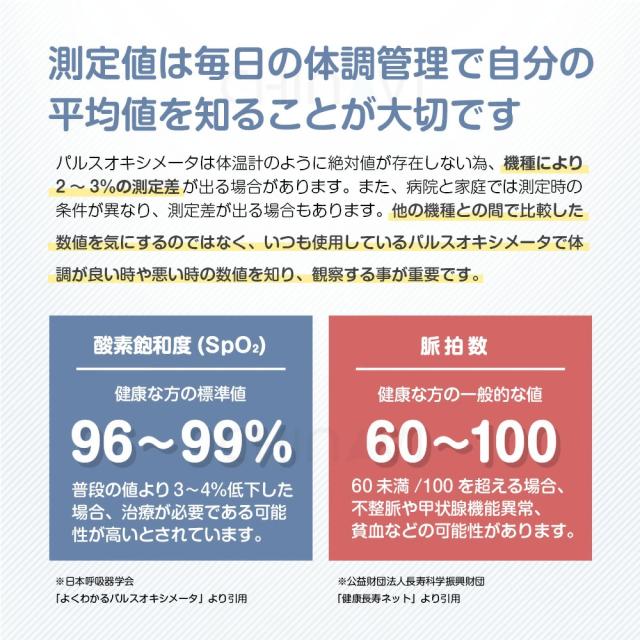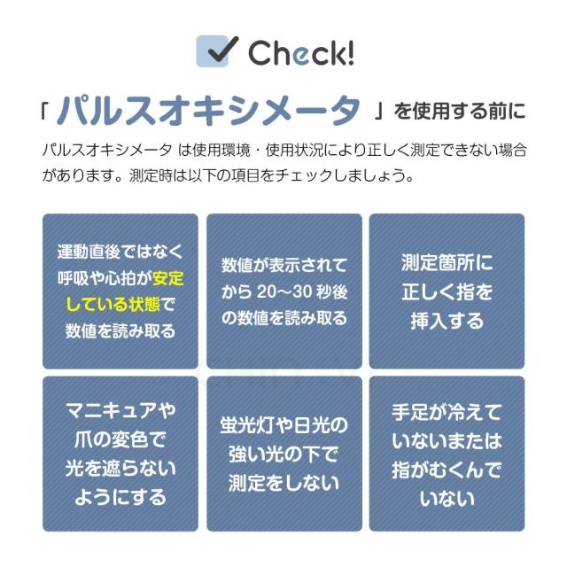| ご使用上の注意 | ・新生児や乳児に使用しないでください。 ・指が細い方やお子様は計測が出来ない場合もございます。 ・太陽光の下での計測や高照度の周辺光下では、測定値が不正確になる事があります。 ・爪や指の状態により測定値が不正確になる事があります。 ・歩行など動いている状態では測定値が不正確になる事があります。 ・長時間装着したままにしないでください。 |
