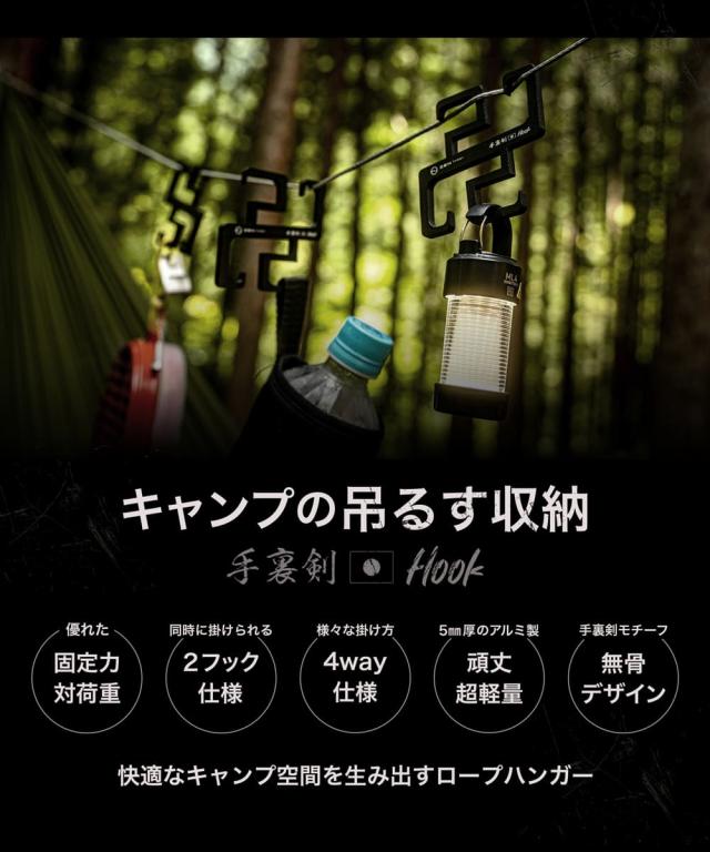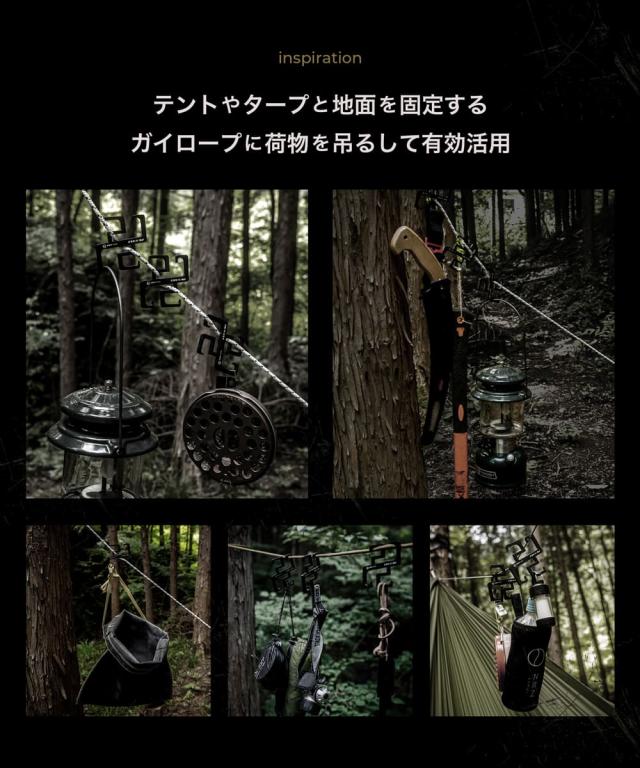 キャンプに行くと物の置き場に困ることがよくあります。テーブルやラックを出して、その上にものを置くのも良いのですが手間がかかったりスペース取ったりします。テントやタープを設営するときにガイラインは必ず使うので、そのロープに手裏剣フックを固定してものを吊るすことでロープを有効活用できます。