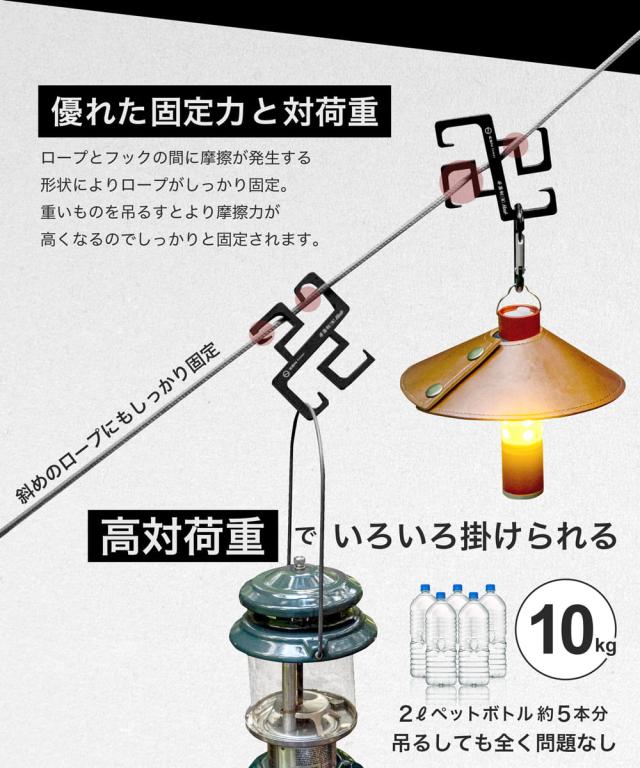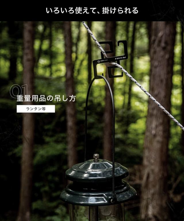 キャンプ用品を平置きせずに吊るすので汚れることもありません。またロープだけでなくて色々な場所にかけることができるので”空中に収納する”ことができるフックです。テーブルやラックを持っていくのは重たいのでミニマムなキャンプを目指すキャンパーにおすすめの商品です。