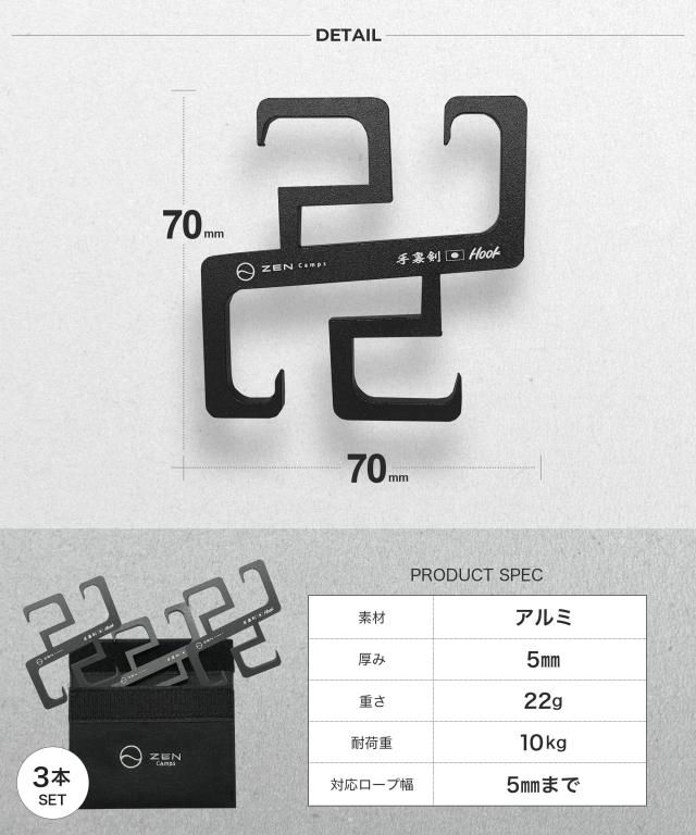 ZEN Camps 手裏剣フック (3本セット) ロープフック ロープハンガー 引掛けフック S字フック キャンプ テント タープ キャンプ アウトドア