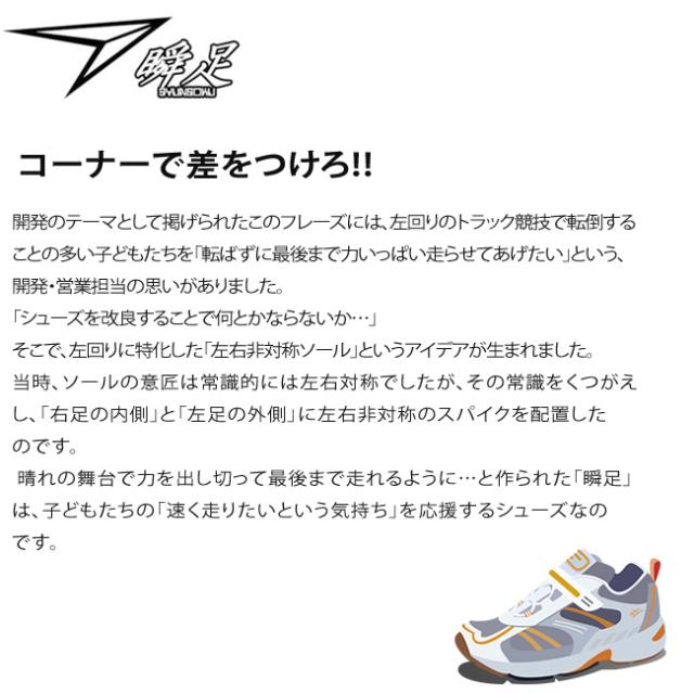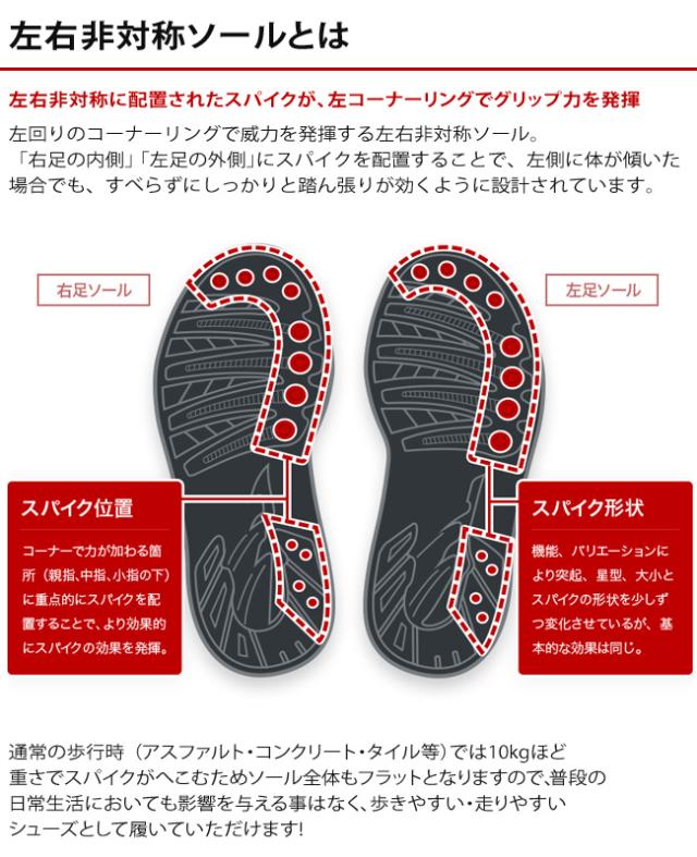 瞬足の最大の特長である、トラック競争で左回りのコーナーを攻略するための左右非対称設計のソール&スパイクを搭載。