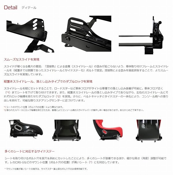 シートを取り付けるボルト穴を長穴&斜めにカットしたことにより、多くのシートが装着できるほか、細かな高さ(角度)調整が可能です。レカロRS-Gなどのマウント位置(ボルト穴の位置)が高いシートにも対応しています。