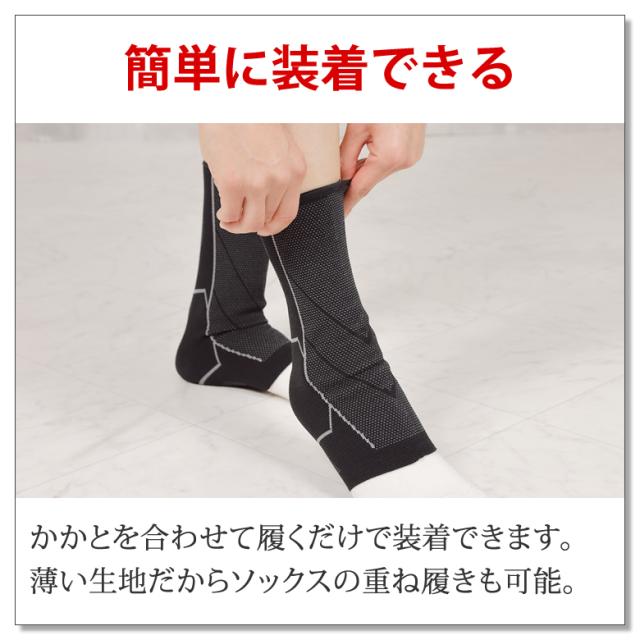 かかとを合わせて履くだけで装着できます。薄い生地だからソックスの重ね履きも可能。