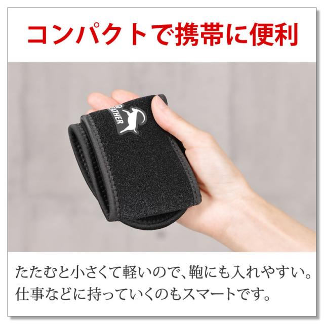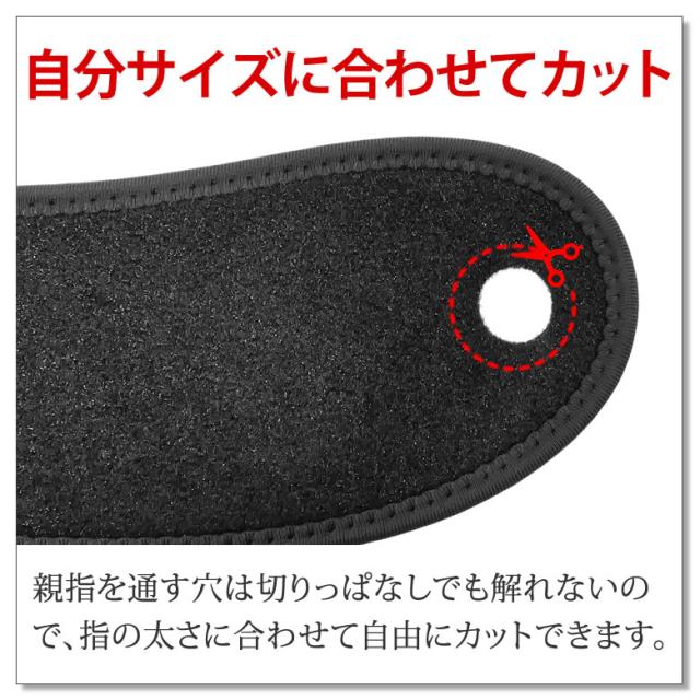 穴に親指を通して手に巻き付けて面ファスナーで留めるだけなので、好きな締め具合でしっかり固定できます。