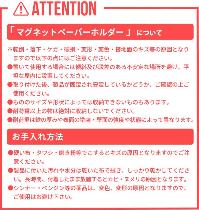 | ※転倒・落下・ケガ・破損・変形・変色・接地面のキズ等の原因となりますので以下の点にはご注意ください。 ●置いて使用する場合には傾斜及び段差のある不安定な場所を避け、平坦な屋内に設置してください。 ●取り付けた後、製品が固定され安定しているかどうか、ご確認の上ご使用ください。 ●液体や湿ったもの、生ものなどは直接入れないでください。 ●柑橘類の皮に含まれるテルペンや油脂は変質することがありますので直接入れないでください。 ●もののサイズや形状によっては収納できないものもあります。 ●耐荷重以上は絶対に収納しないでください。 ●耐荷重は鉄の厚みや表面の塗装・壁面の強度や状態によって異なります。 |