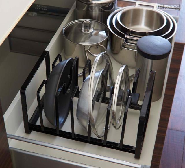 形やサイズがバラバラのフライパンや鍋フタはとりあえず重ねて収納しがちに。重ねて置くと下の物が取り出しづらかったり傷が付くのも心配です。タワーのフライパン&鍋蓋スタンドなら重ねずに立てて収納することができるので、スッキリと整理整頓が叶います♪