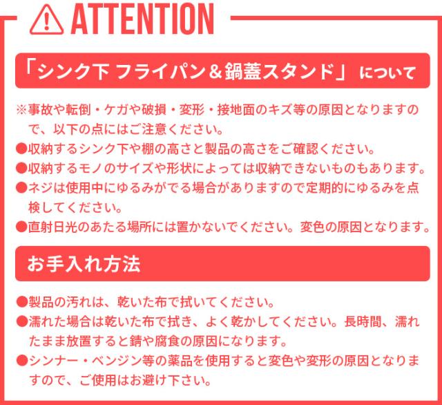 | ※転倒・落下・ケガ・破損・変形・変色・接地面のキズ等の原因となりますので以下の点にはご注意ください。 ●収納するシンク下や棚の高さと製品の高さをご確認ください。 ●収納するモノのサイズや形状によっては収納できないものもあります。 ●ネジは使用中にゆるみがでる場合がありますので定期的にゆるみを点検してください。 ●直射日光のあたる場所には置かないでください。変色の原因となります。 |
