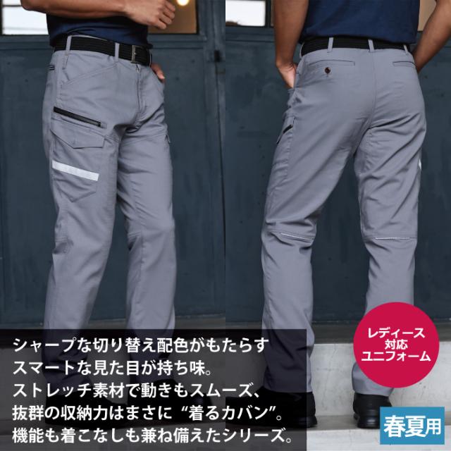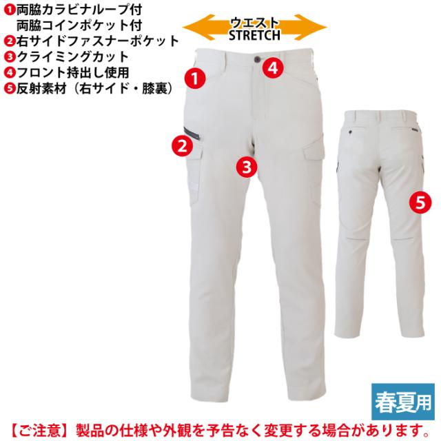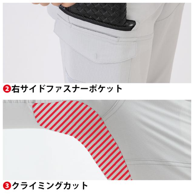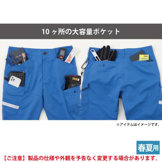 ◇機能:両脇カラビナループ付・両脇コインポケット付・右サイドファスナーポケット・クライミングカット・フロント持ち出し仕様・反射素材(右サイド・膝裏)・10ヶ所の大容量ポケット・上から入るスマホポケット・JIS帯電防止規格合格・帯電防止素材使用・ストレッチ・接触冷感・樹脂穴ボタン