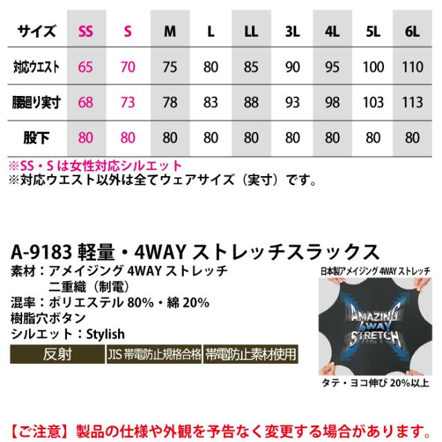 コーコス 作業服 春夏用 A-9183 軽量・4WAYストレッチスラックス SS-LL