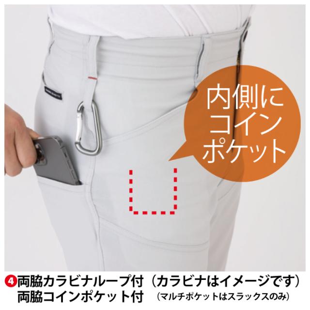 ◇機能:クライミングカット・フロント持ち出し仕様・反射素材(膝裏)・両脇カラビナループ付・両脇コインポケット付・スマホも入る右サイドマルチポケット・オールシーズン対応素材・JIS帯電防止規格合格・帯電防止素材使用・ストレッチ・樹脂穴ボタン