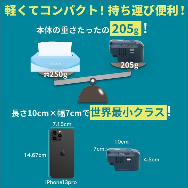 | 商品説明 | マキタバッテリーがポータブル電源に変身! USBだけじゃない!コンセントも使える!! ●家庭用のコンセントが使用できます。 ※日本専用仕様の二股のコンセントです。 ●USBポートが同時に2個使えます。 災害時のスマホの充電、停電時のLEDライトにもなって、いざという時に安心です。 キャンプでも大活躍! |