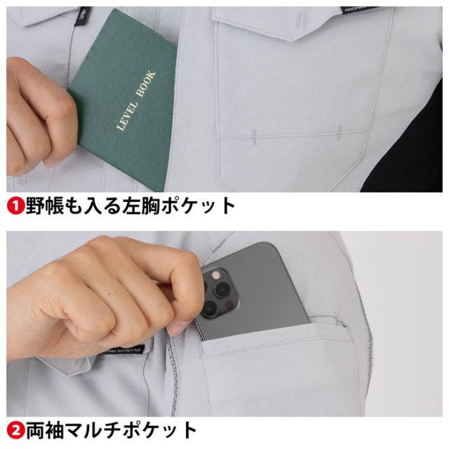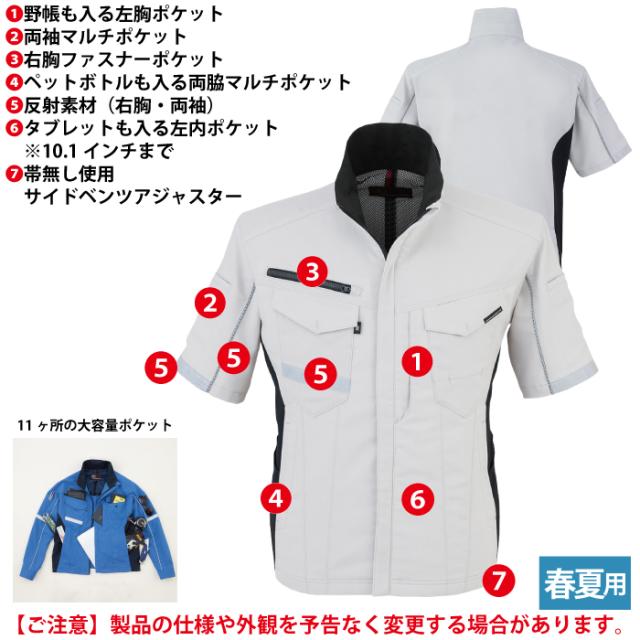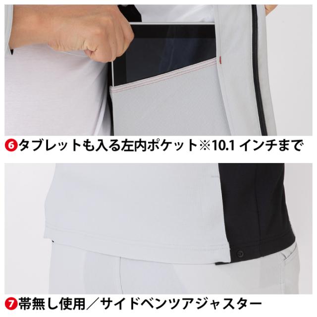 ◇機能:野帳も入る左胸縦ポケット・両袖マルチポケット・反射素材(右胸・両袖)・右胸ファスナーポケット・ペットボトルも入る両脇マルチポケット・タブレットも入る左内ポケット(10.1インチまで)・帯なし仕様・サイドベンツアジャスター・11ヶ所の大容量ポケット・JIS帯電防止規格合格・帯電防止素材使用・ストレッチ・接触冷感・樹脂ドットボタン・樹脂ファスナー