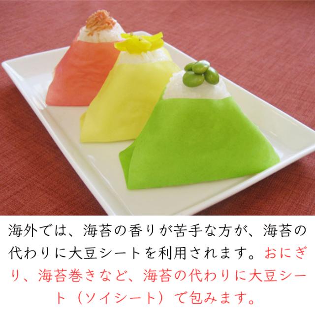海外では、海苔の香りが苦手な方が、海苔の代わりに大豆シートを利用されます。おにぎり、お寿司で利用する海苔の代わりに、大豆シート(ソイペーパー)を利用されています。