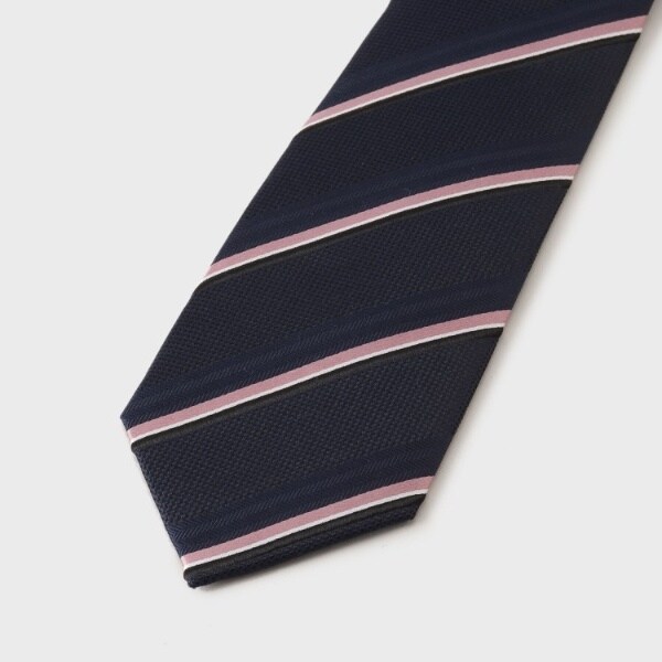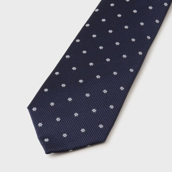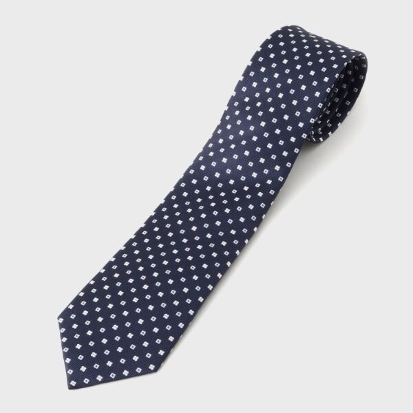 ネイビーやグレーのスーツに合わせ易くて、Vゾーンと顔が暗い印象にならないように、ネクタイにジャカード柄をアクセントに配しています。