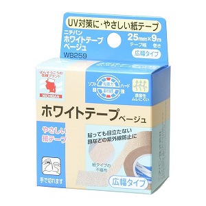 「ニチバン ホワイトテープ ベージュ 幅広タイプ」は、貼っても目立たない、顔などの紫外線防止に便利な広幅タイプの紙テープです。しなやかな紙タイプの不織布に、アクリル系粘着剤を塗布しています。病院でもガーゼ固定などに広く使われています。