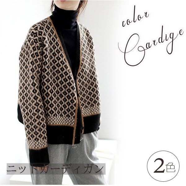 店長イチオシ ニットカーディガン レディース 幾何学柄 ジャガードニットカーディガン 配色ダイス柄 アーガイル柄 トップス アウター ニット 秋冬 着痩