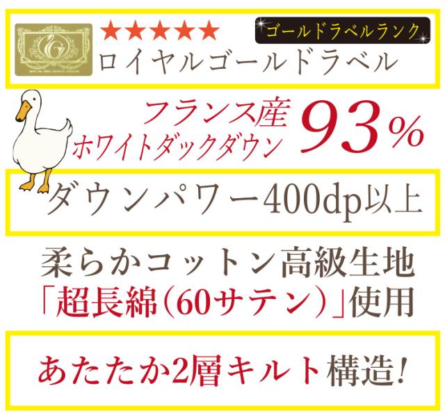 | 仕様 | キルト型:二層キルト ロイヤルゴールドラベル ダウンパワー400dp以上 日本製 |