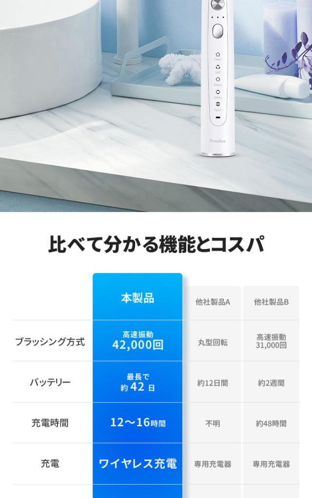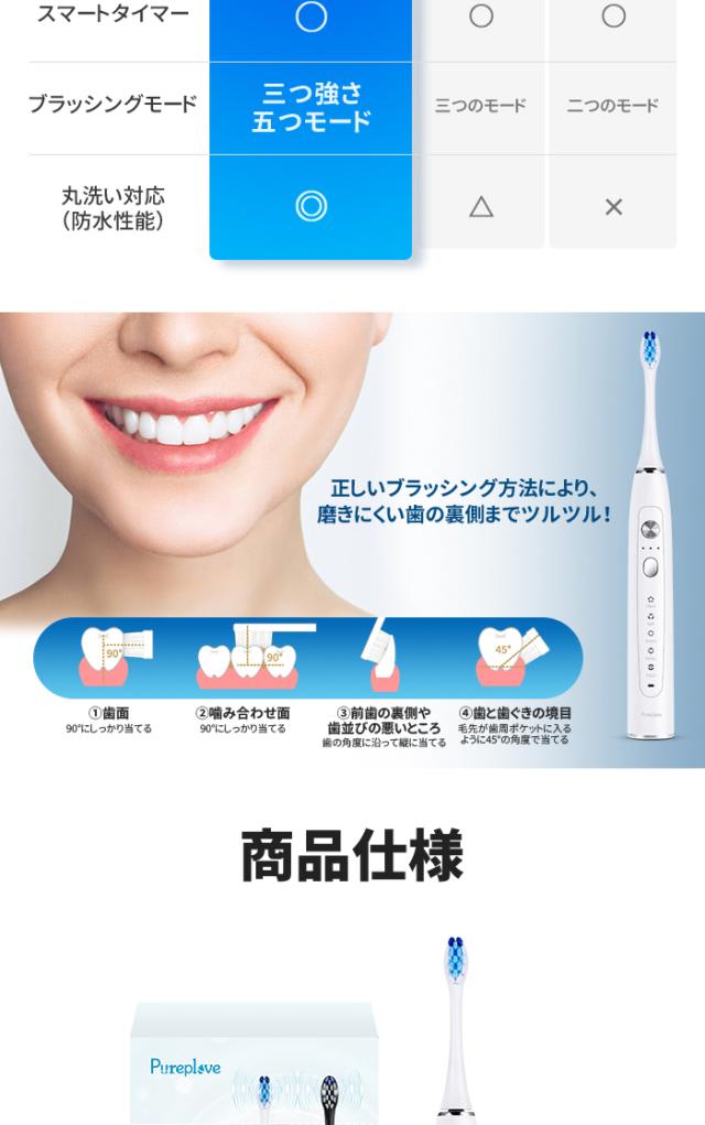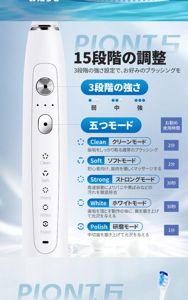 - 注文してから早く商品が届きました。 はじめての電動歯ブラシだったので、ソフトモードを使いました。5種類のモードと3段階のブラッシングの強さが選べるところがとてもいいです。使用後、歯間もきれいに歯もツル...
