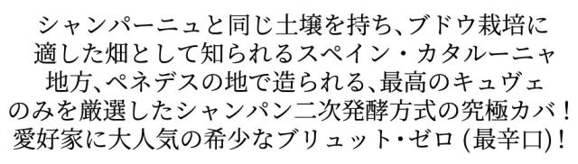 シャンパーニュと同じ土壌を持ち、ブドウ栽培に適した畑として知られるスペイン・カタルーニャ地方、ペネデスの地で造られる、最高のキュヴェのみを厳選したシャンパン二次発酵方式の究極カバ!愛好家に大人気の希少なブリュット・ゼロ(最辛口)!■さまざまなギフトアイテムをご用意しております。お中元 ギフト 御中元 お盆 お礼 敬老の日 クリスマス 冬ギフト お歳暮 御歳暮 お年賀 御年賀 お正月 年末年始 ご挨拶 バレンタイン ホワイトデー お返し 父の日 母の日 ギフト 贈答品 お土産 手土産 御祝 御礼 内祝い 引き出物 お祝い 結婚祝い 結婚内祝い 出産祝い 出産内祝い 引き菓子 快気祝い 快気内祝い 進学祝い 誕生日祝い バースデーケーキ プレゼント Wedding ウェディング ホームパーティ お花見 パーティ 退職ギフト 退職 就任祝い