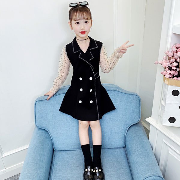 子供服 ワンピース ブラック フォーマル 結婚式 発表会 入学式 卒業式 七五三 キッズ 女の子 ワンピース 長袖 ドット柄 オシャレ お洒落 長袖 スリム 110-160