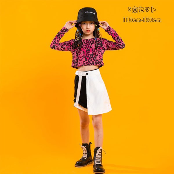 ダンス 衣装 ファッション 女の子 ダンスウェアステージ衣装 ヒップホップ ヒョウ柄トップス+パンツ+スカート 3点セット 長袖 ジャズ 原宿系 お洒落 110-180