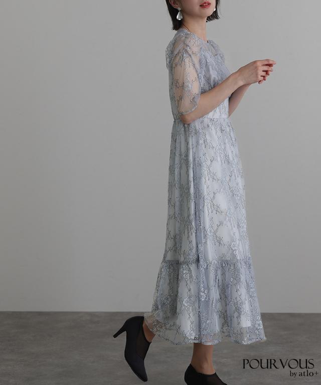 花柄の総レースで華やかさを演出してくれるドレスです。