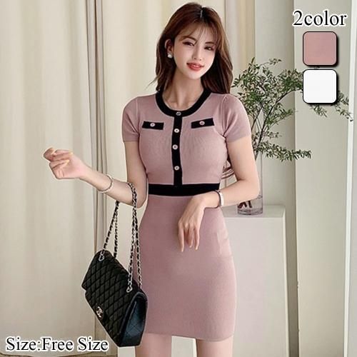 【グラシア】 キャバ ドレス キャバドレス ワンピース ミニドレス シルエット タイト ニュアンスカラー ボディライン 大人 ニット ピンク ホワイト フリーサイズ