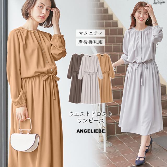 マタニティ 服 ワンピース ウエスト ドロスト 授乳服 妊婦服 長袖 マタニティワンピース 通勤 オフィス お宮参り 産後 無地 ベージュ キャメル グレー