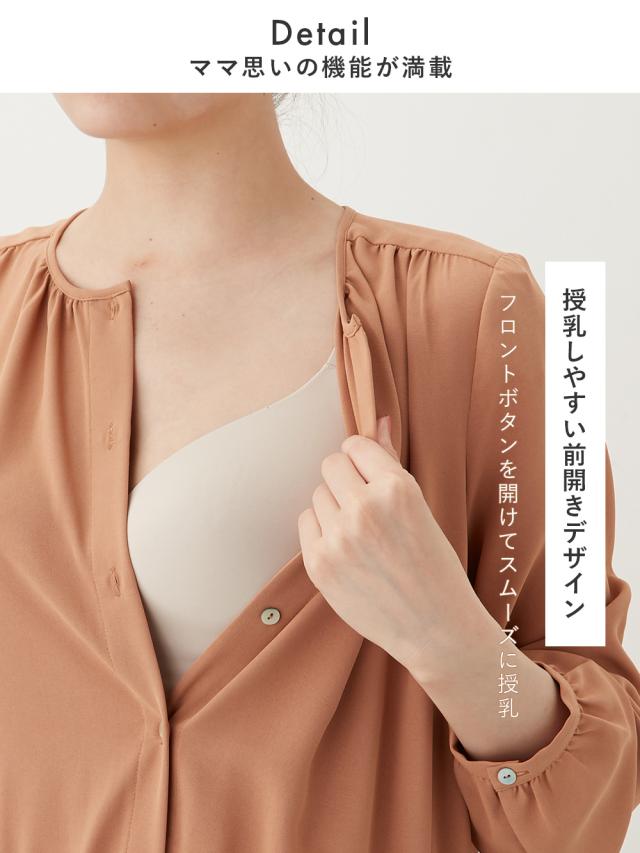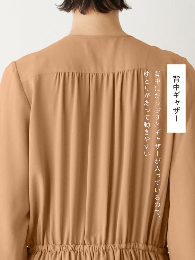 素材の落ち感をいかしたすっきりシルエットですが、たっぷりとギャザーをほどこしているのでマタニティ期もゆったり着られます>。