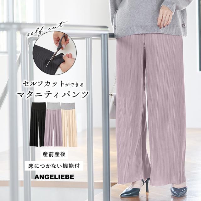 マタニティ 服 パンツ 裾が床につかない機能付 セルフカット プリーツパンツ ワイドパンツ 授乳服 妊婦服 長ズボン マタニティパンツ 無地