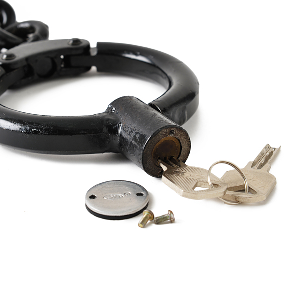 遥か昔から使用され続けたイメージのある足錠は3kgとずっしりと重く、鍵穴はカバーは覆われて見えなくなっています。