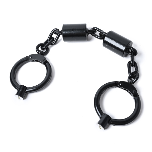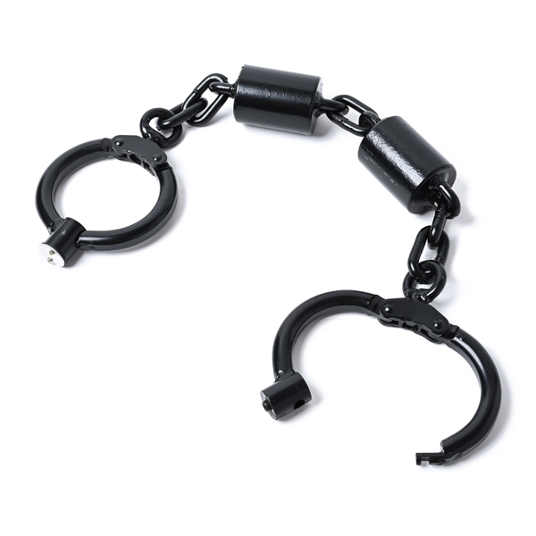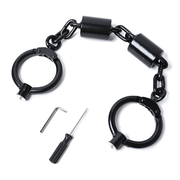 遥か昔から使用され続けたイメージのある足錠は8kgとずっしりと重く、鍵穴はカバーは覆われて見えなくなっています。開錠するにはまず鍵穴カバーのネジを2本外し、カバーを外した後に現れる鍵穴に付属の六角棒スパナを使用して開錠します。ちなみにカバーのネジを外すためのドライバーも付属しています。一般的な手錠のモデルとは違い、締め込み調節やダブルロック機構はありませんが、何よりシンプルで頑丈な足錠となっています。 お芝居や、コレクションにどうぞ