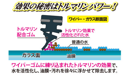 ・ワイパーゴムに練り込まれた「トルマリン(電気石)」の効果で、水を活性化させて油膜を浮き上がらせて除去します。