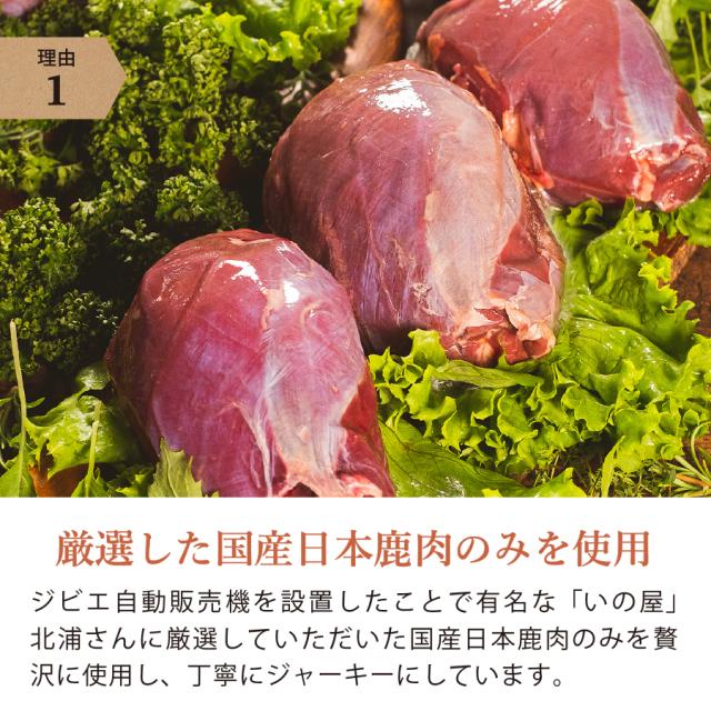 厳選した国産日本鹿肉のモモ部位のみを使用した贅沢な無添加ジャーキー。