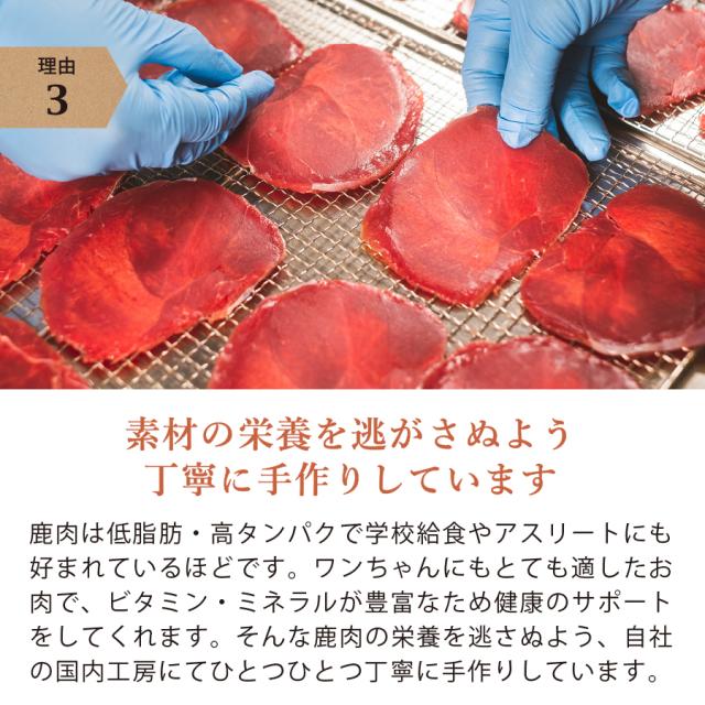 鹿肉のスライスから乾燥まで国内の自社工房にて丁寧に手作りしています。