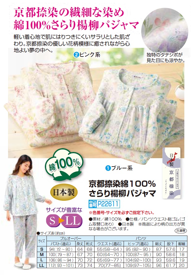 日本製 京都捺染綿100%さらり楊柳パジャマ(全2色) 前開きパジャマ レディース 婦人服 ミセス シニア 女性 寝巻 寝間着 ピンク ブルー シニアファッション 50代 60代 70代 80代 母の日 お母さん