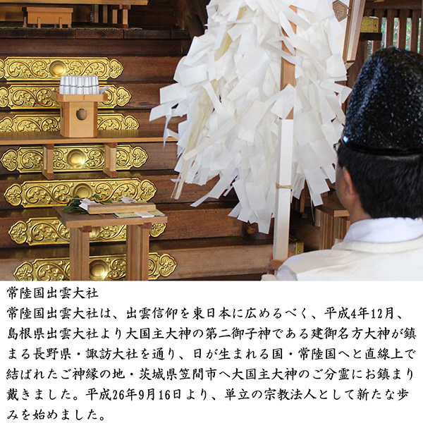 全国有数のパワースポットとしても知られている茨城県・笠間の「常陸国出雲大社」にて、厄除けのご祈祷を施していただきました。体にもご使用いただけます