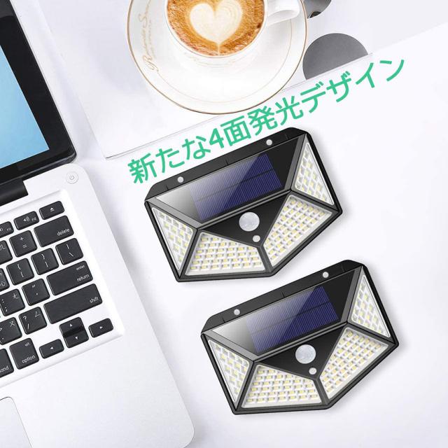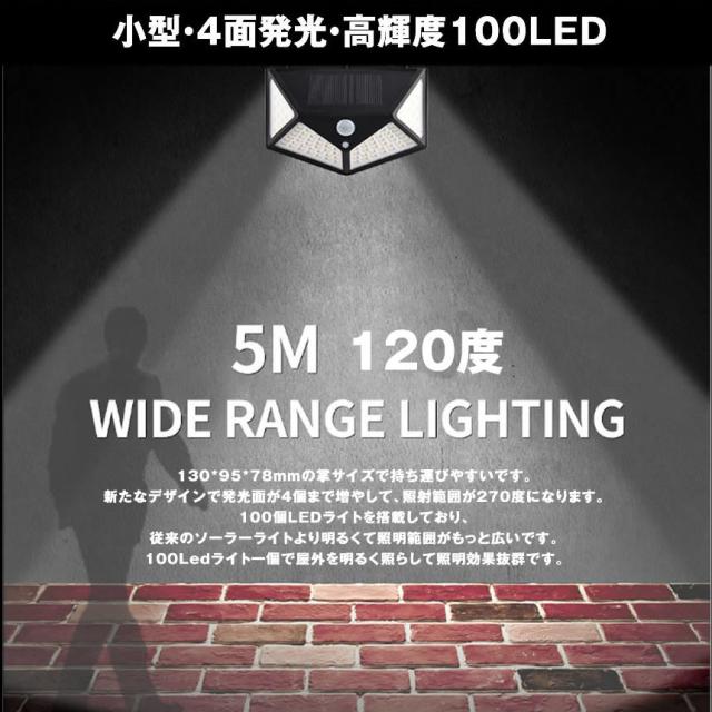 【小型・4面発光・高輝度LED】130*95*78mmの掌サイズで持ち運びやすいです。新たなデザインで発光面が4個まで増やして、照射範囲が300°以上になります。また、最新版のセンサーライトは高輝度LEDライトを搭載しており、従来のソーラーライトより明るくて照明範囲がもっと広いです。Ledセンサーライト一個で屋外を明るく照らして照明効果抜群です。