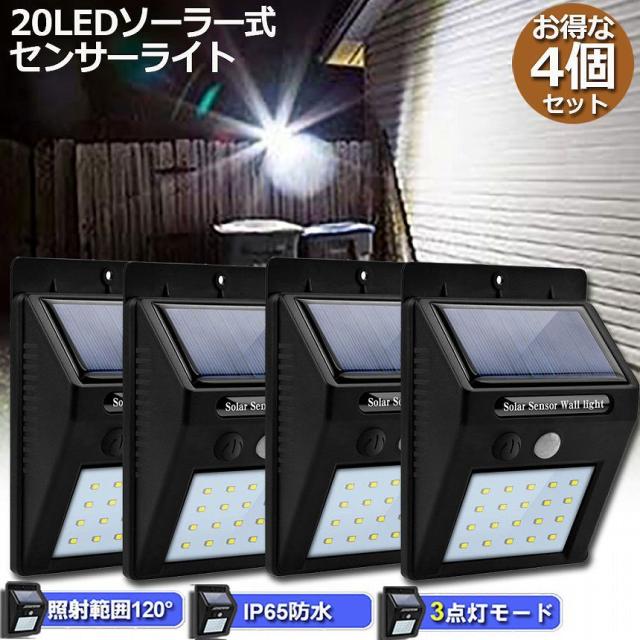 センサーライト 屋外 ソーラーライト 4個セット 20LED 3つ知能モード 高輝度 防犯 人感 防水 屋外照明 120°照明範囲 防犯ライト 夜間自動点灯 太陽光発電 庭 玄関 駐車場 通路 ガーデンライト 大活躍
